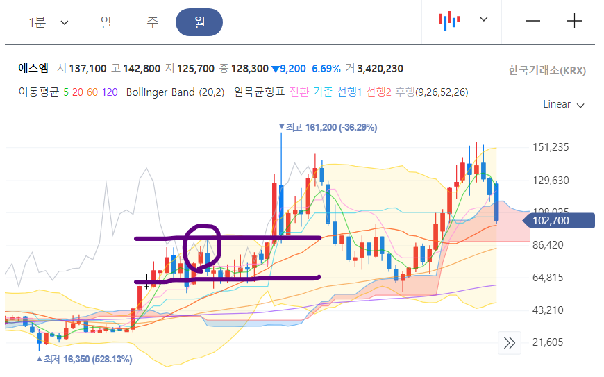 그러나 22년 2월 25일 종가 기준 에스엠의 시가총액은 하이브의 6분의 1에도 미치지 못하고, 연결 매출이 에스엠의 26% 수준인 JYP와 유사한 등, 저평가 되어 있는 상황입니다