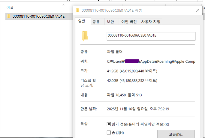 제 백업파일 용량은 약 42G 였습니다. SSD 용량이 240G니까 거의 6분의 1을 아이폰 백업파일이 차지하고 있었네요.