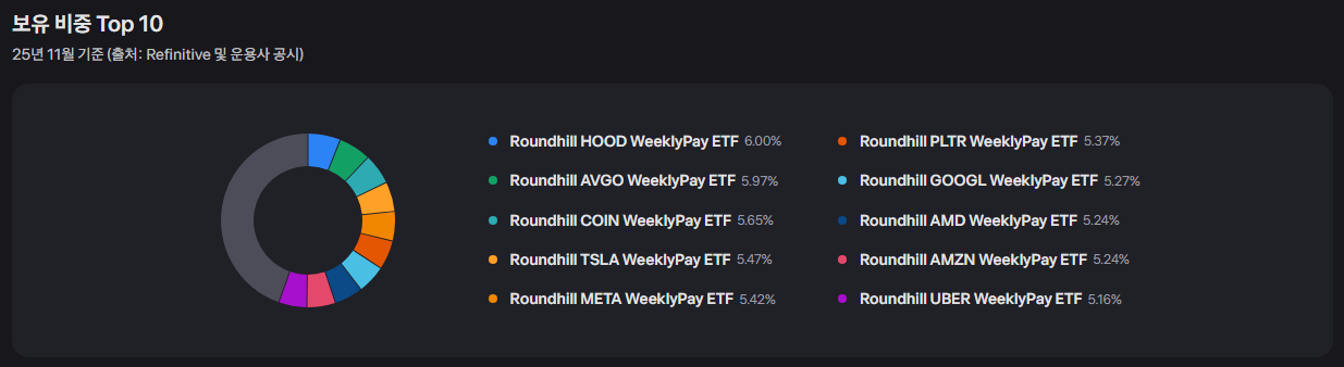 WPAY는 Roundhill WeeklyPay Universe ETF로 미국의 Roundhill Investments에서 2025년 9월에 출시한 초고배당 ETF입니다. Roundhill이라는 자산운용사에서는 개별주 주배당 상품을 운용하고 있는데요. 대표적인 종목은 구글/테슬라/팔란티어 등 미국 대형테크 기업들의 주식을 기초자산으로 하고 옵션 매매로 벌어들인 수익금을 분배금으로 지급하는 구조 입니다.