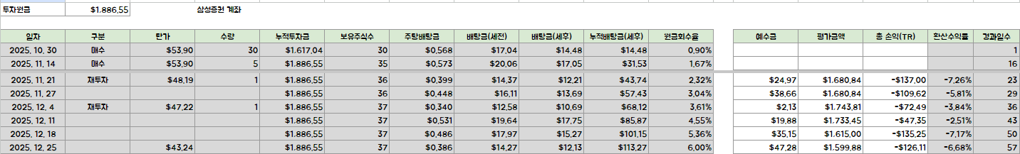 최초 투자원금은 $1,886.55로 환율 1,450원으로 환산하면 약 270만원 수준입니다. 최초 매수시점은 25년 10월 30일로 주당 $53.90에 30주를 매수 했습니다. 이후에 5주를 추가 매수해 35주로 이 투자를 시작하게 되었어요. (초기 내용이 잘 정리가 안된 상태라 전체 투자원금 기준으로 역으로 환산했으니 이 부분은 감안하고 보시면 됩니다.)
