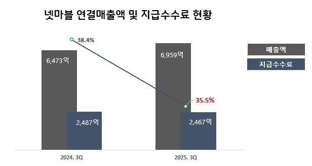 2025년 3분기 넷마블의 연결 매출액은 전년 동기 대비 7.5% 증가한 6,959억원 입니다. 같은기간 지급수수료 비용은 2,467억원으로 매출액 대비 지급수수료 비중은 35.5%를 기록했습니다. 매출액은 7.5% 증가했지만 지급수수료는 0.8%가 감소한 효과를 보였는데요. 넷마블이 세븐나이츠를 제외한 외부 IP에 지급하는 로열티 수수료 비중이 높다는 것을 고려하더라도 자체 결제를 통한 수수료 절감 효과가 실적 개선에 큰 영향을 준 것은 틀림없어 보입니다. 넷마블의 2024년 3분기 및 2025년 3분기 연결재무제표 기준 매출액과 지급수수료 비용을 정리한 아래 차트를 보시면 그 차이가 확연하게 느껴지실 거에요.