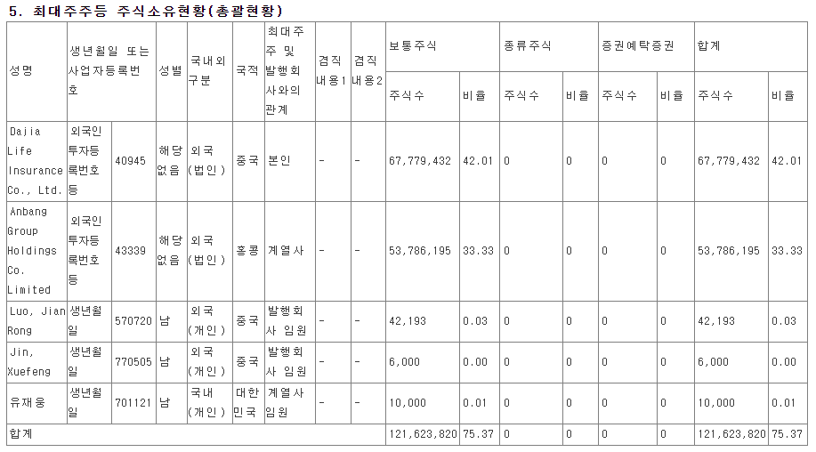 2021년 12월 21일 최대주주등 소유주식 변동신고서 공시를 살펴보면, 동양생명의 최대주주는 [Dajia life Insurace]와 [Anbang Group Holdings] 등 특수관계인으로써 소유주식 총수는 무려 121,623,820주(지분율 75.37%)다. 이 지분율을 그대로 유지한다고 가정할 경우 중국계 자본에게 돌아가는 배당금(유재웅 대표이사 주식수 제외)은 754억원 이다. (국부유출은 자본시장이 완전 개방된 시점에서 이미 예견된 일)